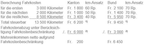 Der steuerpflichtigen Person steht für die Fahrt zur Arbeitsstätte kostenlos ein Geschäftsfahrzeug zur Verfügung. Die Distanz zwischen Wohnadresse und Arbeitsstätte beträgt 30 Kilometer. Dies ergibt eine jährliche Fahrleistung von 13 500 Kilometer (60 km pro Tag x 225 Arbeitstage). Die steuerbare Leistung berechnet sich wie folgt: