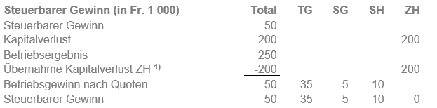 Der Gesamtbetriebsverlust wird definitiv mit dem Kapitalgewinn im Sitzkanton Thurgau verrechnet. Der übernommene Betriebsverlust im Kanton St. Gallen kann in den Folgejahren nicht an diesen zurück belastet werden bzw. kann nicht mit allfällig dort anfallenden Betriebsgewinnen späterer Jahre verrechnet werden.
