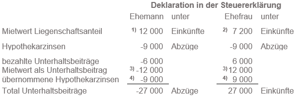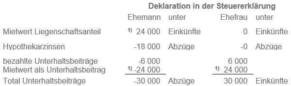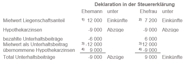 Die unentgeltliche Überlassung der Liegenschaft bzw. eines Liegenschaftsanteils gilt steuerrechtlich als Unterhaltsbeitrag. Ebenfalls steuerrechtlich als Unterhaltsbeitrag gilt es, wenn ein getrennt lebender oder geschiedener Ehegatte die Zahlung der Hypothekarzinsen auf dem Hypothekarschuldanteil des anderen Ehegatten übernimmt (vgl. StP 25 Nr. 2 Einkünfte aus Unterhaltsbeiträgen und StP 34 Nr. 12 Abzug der Unterhaltsbeiträge).