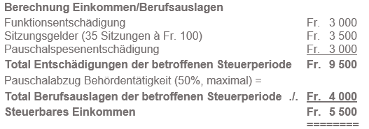 Der Pauschalabzug für Behördentätigkeit kann von Behördenmitgliedern in hauptamtlicher Funktion nicht geltend gemacht werden. Dies gilt auch für Steuerpflichtige, die aufgrund einer Anstellung bei einem Gemeinwesen in einer Behörde in beratender Funktion einsitzen (z.B. Gemeinderatsschreiber, Schulleitungsmitglieder etc).