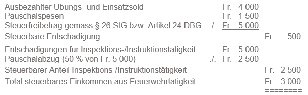 Von der Steuerfreiheit ausgenommen sind Pauschalzulagen für Kader, Funktionszulagen sowie Entschädigungen für administrative Arbeiten und für Dienstleistungen, welche die Feuerwehr freiwillig erbringt. Die nachgewiesenen Aufwendungen, welche zur Erzielung dieser steuerbaren Entschädigungen anfallen, können als Berufsauslagen in Abzug gebracht werden.