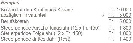 Bei Anschaffungskosten bis Fr. 2 000.- kann die Hälfte einmalig abgezogen werden. Die Kosten auf Grund eines Mietkaufvertrages sind nur zur Hälfte abziehbar.
