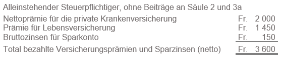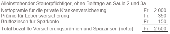 Von der Summe der Einlagen, Prämien und Beiträgen an die Lebens-, Kranken- und Unfallversicherungen sowie der erhaltenen Zinsen auf Sparkapitalien sind die in der Steuerperiode erhaltenen Prämienverbilligungen (IPV) abzuziehen.