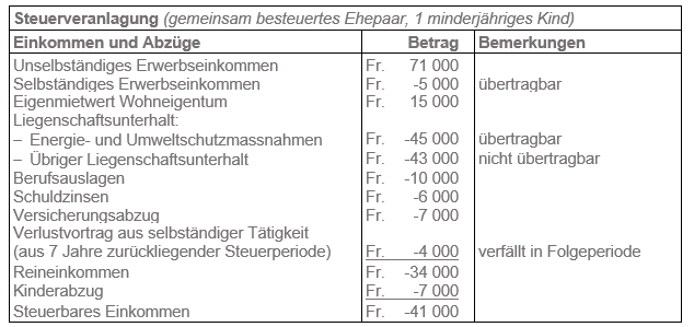 Von den Energiespar- und Umweltschutzmassnahmen von Fr. 45'000 können Fr. 11'000 mit dem Reineinkommen der betreffenden Steuerperiode verrechnet werden. Die restlichen Fr. 34'000 stellen übertragbare Kosten dar, welche maximal auf die zwei nächsten Steuerperioden übertragen werden können.