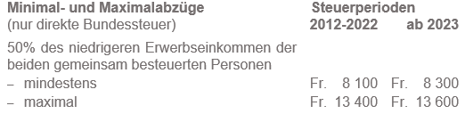 Bei den nachfolgend unter den Ziffern 2 bis 6 aufgeführten allgemeinen Abzügen gelten sowohl bei den Staats- und Gemeindesteuern als auch bei der direkten Bundessteuer gesetzlich festgelegte Maximalabzüge (Zweiverdienerabzug auch Minimalabzug). Dabei erfolgt bei der direkten Bundessteuer regelmässig ein Ausgleich der kalten Progression. Nachfolgend sind die Maximalansätze pro Steuerperiode aufgeführt.