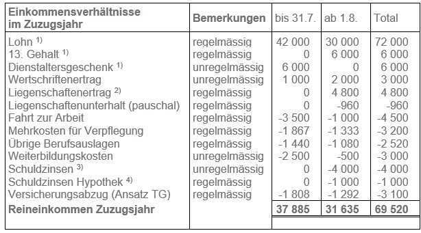 Es werden nur die seit dem Zuzug (1. August) angefallenen Lohnbestandteile berücksichtigt. Das 13. Monatsgehalt im Dezember betrifft das gesamte Zuzugsjahr, weshalb für die Satzbestimmung keine Hochrechnung erfolgt.