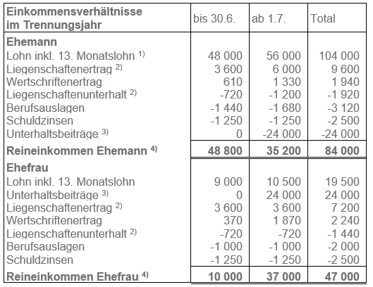 Unterhaltsbeiträge an Ehefrau und Kinder: Die Überlassung der Liegenschaft (Mietwert ab 1. Juli = Fr. 6'000) gilt als Unterhaltsbeitrag. Der Ehemann kann die Zahlungen von Fr. 18'000 und den Mietwertanteil von Fr. 6'000 als Unterhaltsbeiträge abziehen. Die Ehefrau versteuert die erhaltenen Beiträge und den Mietwertanteil des Ehemannes als Unterhaltsbeiträge.