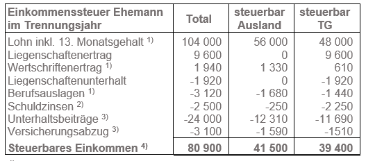 Zur Bemessung der Einkommenssteuer wird das gesamte im Trennungsjahr erzielte Reineinkommen herangezogen und mittels einer Steuerausscheidung zwischen dem Kanton Thurgau bzw. der Schweiz sowie dem Ausland aufgeteilt: