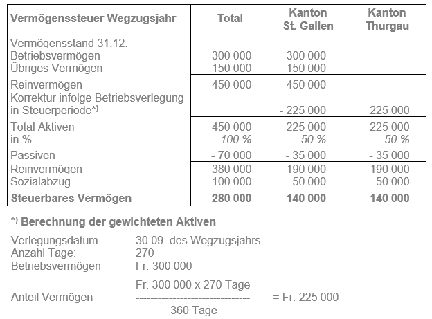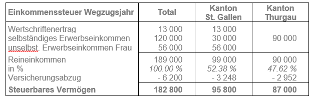 Klara und Fritz Müller verlegen ihren Wohnsitz sowie das Geschäft des Ehemannes am 30. September vom Kanton Thurgau in den Kanton St. Gallen. Die Einkommens- und Vermögensverhältnisse zeigen folgendes Bild: