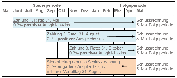 Vorausgesetzt, dass die provisorische Steuerrechnung und die Schlussrechnung in etwa gleich hoch sind, ergeben Einzahlungen der Steuerraten vor oder zu den üblichen Terminen (31.5., 31.8., 31.10. der Steuerperiode) Ausgleichszinsensaldi zu Gunsten des Steuerpflichtigen. Verspätete Einzahlungen der Steuerraten führen demgegenüber zu Ausgleichszinsensaldi zu Lasten des Steuerpflichtigen.