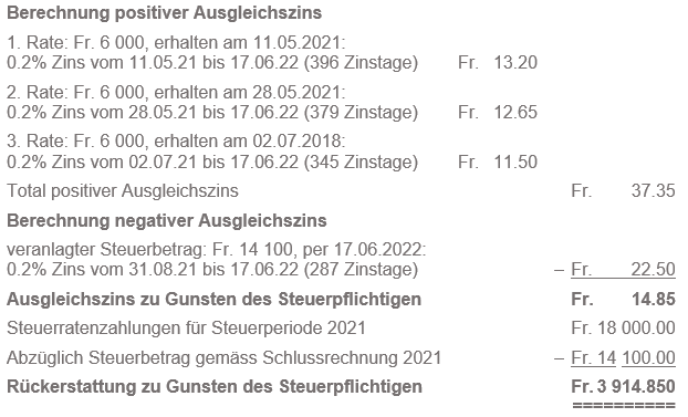 Ende März 2022 reicht die steuerpflichtige Person die Steuererklärung für das Jahr 2021 ein und wird Mitte Mai definitiv veranlagt. Nach Rechtskraft der Veranlagung wird per 17.06.2022 die Schlussrechnung für das Jahr 2021 gestellt. Die geschuldeten Staats- und Gemeindesteuern betragen Fr. 18'000.