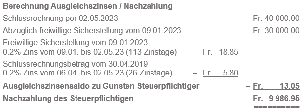 Ein Steuerpflichtiger verkauft seine Liegenschaft (Handänderung 06.01.2023). Er leistet für die Grundstückgewinnsteuer am 09.01.2023 eine freiwillige Sicherstellung von Fr. 30'000. Die für die Festlegung der Steuer notwendigen Bauabrechnungen reicht er erst verspätet ein, weshalb die definitive Steuerveranlagung erst am 27.03.2023 erfolgt. Die Schlussrechnung wird nach Rechtskraft der Veranlagung am 02.05.2023 erstellt. Die Grundstückgewinnsteuer beträgt Fr. 40 000.