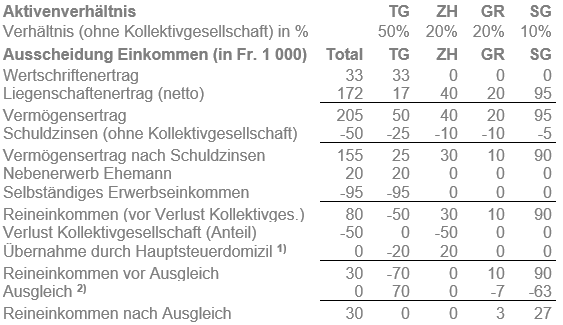 Das Hauptsteuerdomizil des Ehepaars befindet sich im Kanton Thurgau. Es besitzt private Liegenschaften in den Kantonen Graubünden, St. Gallen und Zürich. Der Ehemann ist Teilhaber an einer Kollektivgesellschaft mit Sitz im Kanton Zürich.