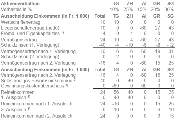 Im interkantonalen Verhältnis ist das gesamte Geschäftseinkommen am Geschäftsort steuerbar. Dagegen erhält im interkommunalen Verhältnis (zwischen zwei Thurgauer Gemeinden) das Hauptsteuerdomizil ein Tätigkeitsentgelt (vgl. StP 2 Nr. 15 Steuerausscheidung: Tätigkeitsentgelte Selbständigerwerbender).