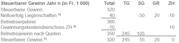 Der Gesamtgewinn im Jahr n beträgt Fr. 320'000. Der Gewinnungskostenüberschuss der Kapitalanlageliegenschaft St. Gallen wird mit Fr. 50'000 und derjenige der Kapitalanlageliegenschaft Zürich mit Fr. 10'000 ausgewiesen. Für die Kapitalanlageliegenschaft im Kanton Graubünden wird ein Nettoertrag von Fr. 20'000 erzielt.