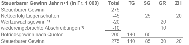 Der Gesamtgewinn im Jahr n+1 beträgt Fr. 275'000. Die Kapitalanlageliegenschaft Graubünden wird mit einem Gewinn von Fr. 30'000 verkauft (Fr. 10'000 wiedereingebrachte Abschreibungen und Fr. 20'000 Wertzuwachsgewinn). Nettoertrag der weiteren Kapitalanlageliegenschaften: Zürich Fr. 20'000; St. Gallen Fr. 25'000. Die Ausscheidung des Betriebsgewinns erfolgt nach quotaler indirekter Methode (Jahr n und Jahr n+1: 70% TG / 30% SG).
