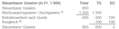 Als Betriebsstättekanton hat St. Gallen den eigenen Betriebsverlust von -25 mit dem Wertzuwachsgewinn von 50 auf der verkauften Liegenschaft zu verrechnen. In der Höhe des verbleibenden Wertzuwachsgewinns von 25 erfolgt eine Verrechnung mit dem Betriebsverlust des Kantons Thurgau.ZG
