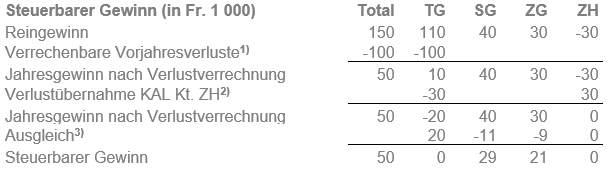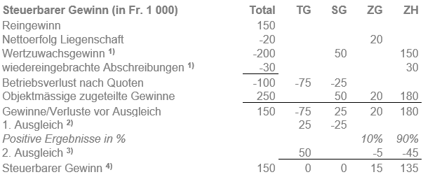 Verluste und Gewinnungskostenüberschüsse werden in erster Linie mit im gleichen Kanton steuerbaren Gewinnen und Erträgen verrechnet. Nicht im gleichen Kanton verrechenbare Verluste und Gewinnungskostenüberschüsse schmälern das nach Quoten zu verteilende Betriebsergebnis.