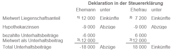 Die unentgeltliche Überlassung der Liegenschaft bzw. eines Liegenschaftsanteils gilt steuerrechtlich als Unterhaltsbeitrag. Ebenfalls steuerrechtlich als Unterhaltsbeitrag gilt es, wenn ein getrennt lebender oder geschiedener Ehegatte die Zahlung der Hypothekarzinsen auf dem Hypothekarschuldanteil des anderen Ehegatten übernimmt (vgl. StP 25 Nr. 2 Einkünfte aus Unterhaltsbeiträgen und StP 34 Nr. 12 Abzug der Unterhaltsbeiträge).