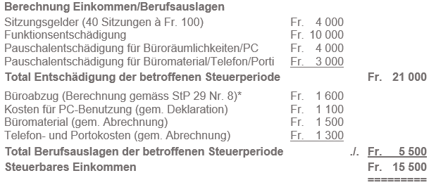 Alle Ratsmitglieder erhalten gemäss Artikel 3a PRG eine Jahresentschädigung für Personal- und Sachausgaben. Dieser vom Bundesgesetzgeber als Spesenersatz bezeichnete Pauschalbetrag stellt grundsätzlich unbesehen von seiner Höhe eine steuerfreie Vergütung dar. Im Gegensatz zu den Spesenpauschalen in der Privatwirtschaft, darf diese Entschädigung von der Veranlagungsbehörde nicht auf ihre Angemessenheit überprüft werden. Mit der steuerfreien Jahresentschädigung sind die übrigen Berufsauslagen (inkl. eines allfälligen Arbeitszimmers in der eigenen Wohnung) vollständig abgegolten.