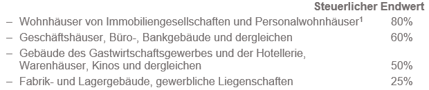 1Werden Wohnhäuser als Bürohäuser genutzt, wird trotzdem der steuerliche Endwert von 80% angewendet.