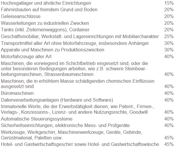 Auf den Buchwerten des übrigen Anlagevermögens werden in der Regel folgende Abschreibungssätze steuerlich anerkannt: