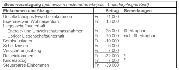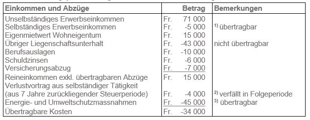 Von den Energiespar- und Umweltschutzmassnahmen von Fr. 45'000 können Fr. 11'000 mit dem Reineinkommen der betreffenden Steuerperiode verrechnet werden. Die restlichen Fr. 34'000 stellen übertragbare Kosten dar, welche maximal auf die zwei nächsten Steuerperioden übertragen werden können.