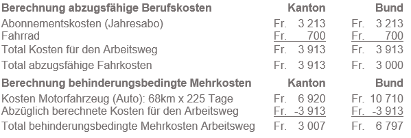 Der steuerpflichtigen Person ist es aufgrund einer Behinderung nicht zumutbar, ihren Arbeitsweg mit den öffentlichen Verkehrsmitteln zurückzulegen. Sie fährt daher jeweils mit dem Privatfahrzeug zur Arbeit. Einer nicht behinderten Person würden für den gleichen Arbeitsweg nur die Kosten für die Benützung der öffentlichen Verkehrsmittel zum Abzug zugelassen.