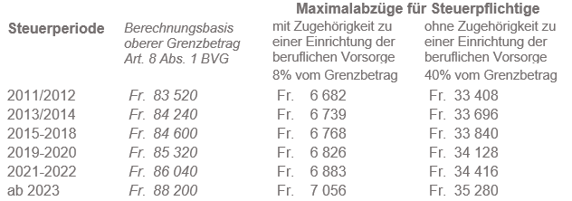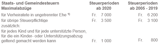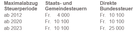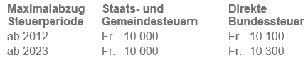 Bei der direkten Bundessteuer erhöhen sich die maximalen Ansätze um die Hälfte, sofern die Steuerpflichtigen keine Beiträge an die Säulen 2 und 3a (Pensionskasse und gebundene Selbstvorsorge) geleistet haben (z.B. AHV-/IV-Rentner/innen). Dieser Abzug kann jedoch nicht zusammen mit dem ordentlichen Abzug beansprucht werden.