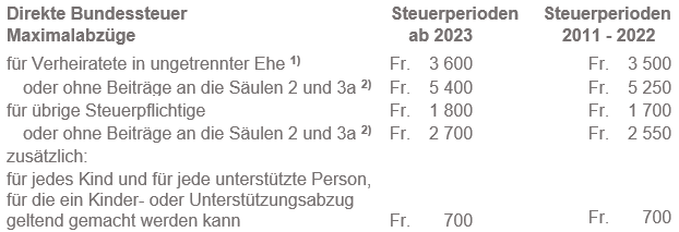 Bei den nachfolgend unter den Ziffern 2 bis 6 aufgeführten allgemeinen Abzügen gelten sowohl bei den Staats- und Gemeindesteuern als auch bei der direkten Bundessteuer gesetzlich festgelegte Maximalabzüge (Zweiverdienerabzug auch Minimalabzug). Dabei erfolgt bei der direkten Bundessteuer regelmässig ein Ausgleich der kalten Progression. Nachfolgend sind die Maximalansätze pro Steuerperiode aufgeführt.
