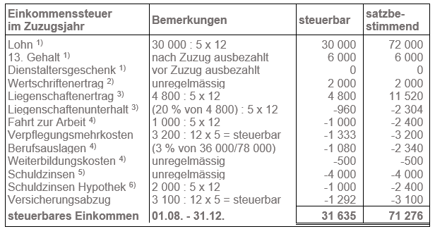 Es werden nur die seit dem Zuzug (1. August) angefallenen Lohnbestandteile berücksichtigt. Das 13. Monatsgehalt im Dezember betrifft das gesamte Zuzugsjahr, weshalb für die Satzbestimmung keine Hochrechnung erfolgt.