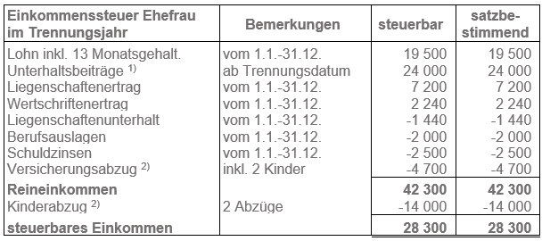 Unterhaltsbeiträge an Ehefrau und Kinder: Die Überlassung der Liegenschaft (Mietwert ab 1. Juli = Fr. 6'000) gilt als Unterhaltsbeitrag. Der Ehemann kann die Zahlungen von Fr. 18'000 und den Mietwertanteil von Fr. 6'000 als Unterhaltsbeiträge abziehen. Die Ehefrau versteuert die erhaltenen Beiträge und den Mietwertanteil des Ehemannes als Unterhaltsbeiträge.