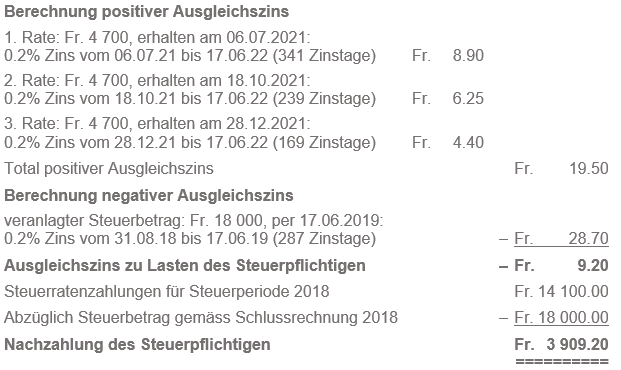 Ende März 2022 reicht die steuerpflichtige Person die Steuererklärung für das Jahr 2021 ein und wird Mitte Mai definitiv veranlagt. Nach Rechtskraft der Veranlagung wird per 17.06.2022 die Schlussrechnung für das Jahr 2021 gestellt. Die geschuldeten Staats- und Gemeindesteuern betragen Fr. 18'000.